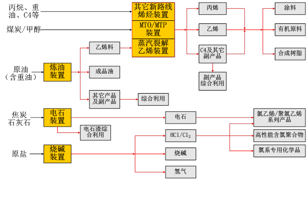 煉油乙烯:煉油(含重油加工)、烯烴(乙烯、丙烯等)、煉化副產(chǎn)品綜合利用(碳四及碳五深加工等)、基本有機(jī)原料、合成樹脂、涂料等;