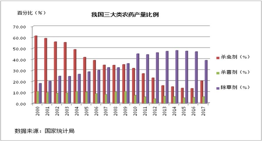 2010年,我國農藥總產量中除草劑、殺蟲劑和殺菌劑的比例分別為18.0%、61.3%和10.6%。到2017年農藥總產量中除草劑、殺蟲劑和殺菌劑的比例分別為39.0%、20.3%和5.8%。這些年,我國農藥品種呈現除草劑產量逐年上升,殺菌劑產量平穩,殺蟲劑產量逐年下降的格局,這顯示出我國農藥種類結構逐步趨向合理,農藥品種結構也得到明顯改善。