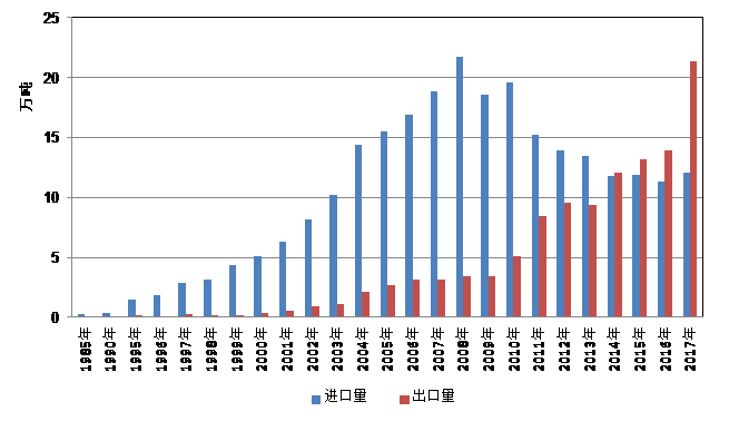 2014年,我國有機(jī)硅結(jié)束了長期依賴進(jìn)口的局面,首次成為初級(jí)形態(tài)硅氧烷凈出口國。我國有機(jī)硅單體歷年當(dāng)量進(jìn)出口量(折硅氧烷)情況見下圖:
