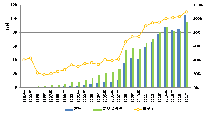 我國有機(jī)硅單體產(chǎn)量、消費(fèi)量整體逐年攀升,自給率不斷提高。1985—2017年,我國有機(jī)硅單體產(chǎn)量年均增長21.6%;消費(fèi)量年均增長17.8%。我國有機(jī)硅單體歷年產(chǎn)量、表觀消費(fèi)量(折硅氧烷)及自給率情況見下圖: