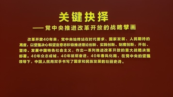 該展覽通過關(guān)鍵抉擇、壯美篇章、歷史巨變、大國氣象、面向未來等主題展區(qū),運用歷史圖片、文字視頻、實物場景、沙盤模型相結(jié)合的手段,展示了改革開放40年來我國的偉大變遷。