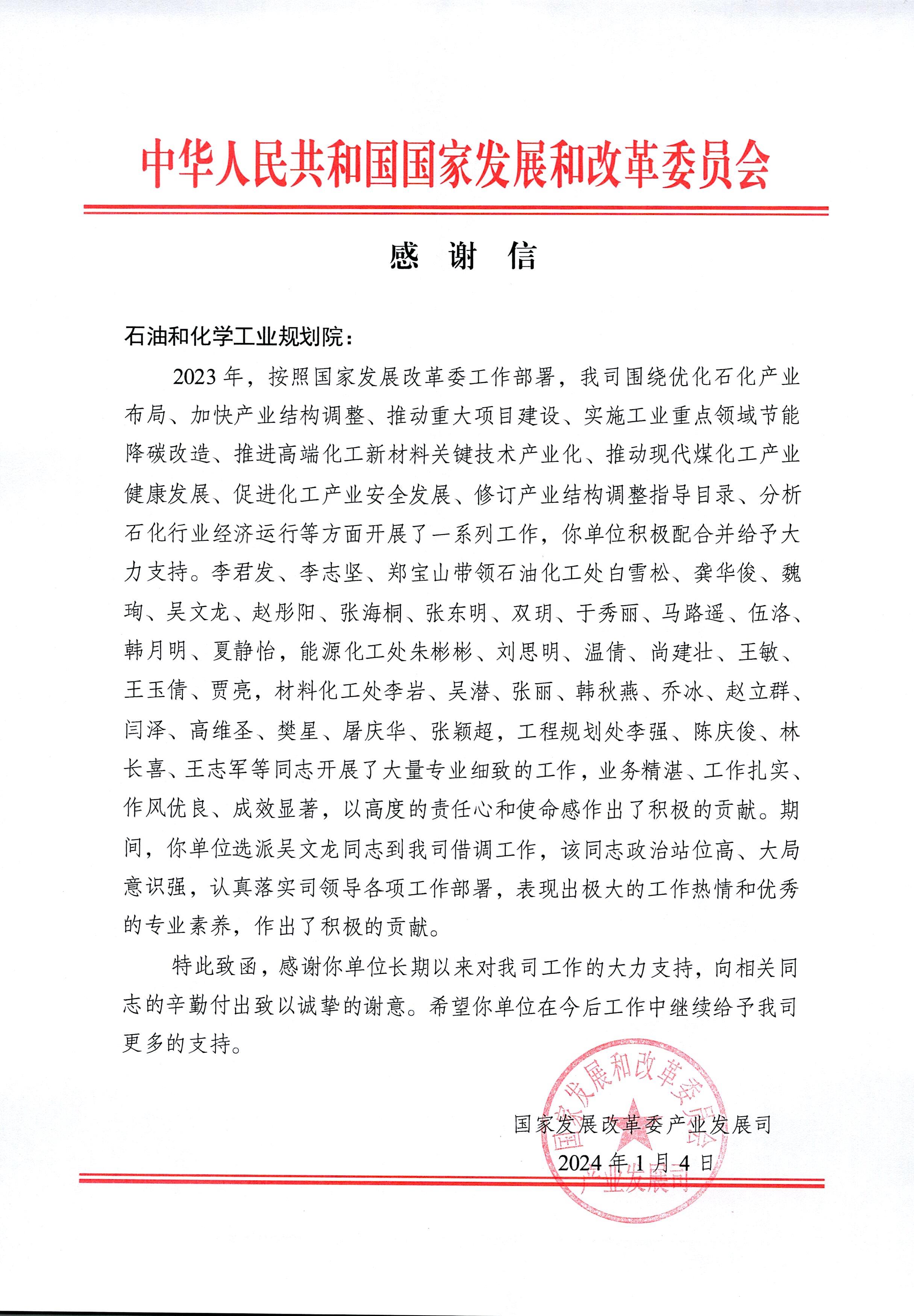 感謝信,是肯定,更是信任。2024年,規劃院將一如既往,再接再厲,以細致的工作,扎實的作風,積極做好石化化工行業重大專題研究,配合國家發展改革委在提升石化產業核心競爭力等方面開展工作,為石化化工行業鍛長板、補短板,延鏈、補鏈,高質量、綠色低碳發展做出新的貢獻。