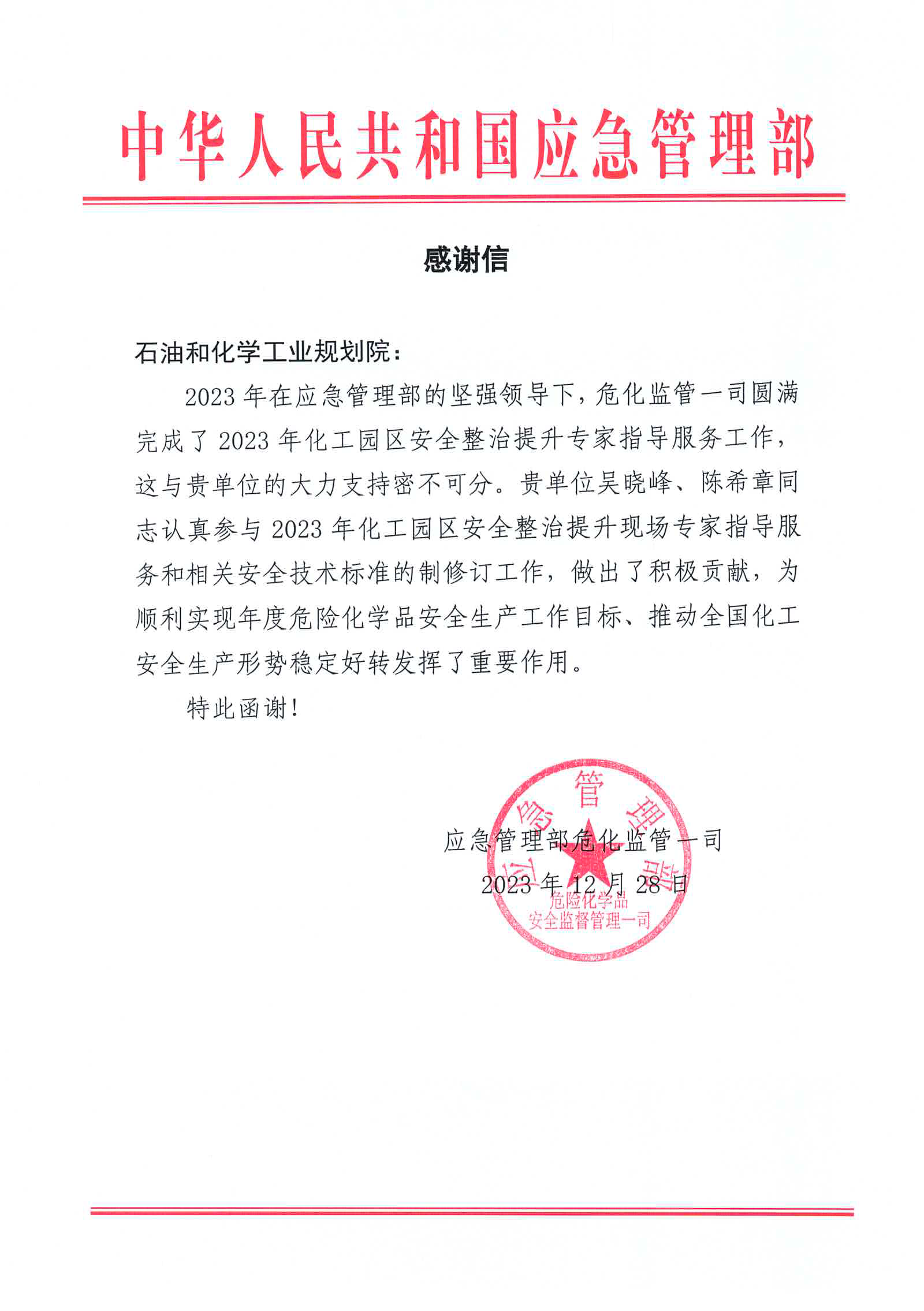 為加強危險化學(xué)品重大安全風(fēng)險防控,加快實現(xiàn)化工園區(qū)集中布局、集群發(fā)展、降低安全風(fēng)險等級,應(yīng)急部持續(xù)開展化工園區(qū)安全整治提升專家指導(dǎo)服務(wù),以進(jìn)一步提升化工園區(qū)安全本質(zhì)安全水平和風(fēng)險管控能力。2023年我院發(fā)揮在產(chǎn)業(yè)規(guī)劃和總體規(guī)劃的優(yōu)勢,參加了本年度12個省、市(含兵團)的化工園區(qū)安全整治提升專家指導(dǎo)服務(wù)工作,助力化工園區(qū)安全整治及高質(zhì)量發(fā)展,在專家指導(dǎo)過程中,強調(diào)化工園區(qū)規(guī)劃編制的必要性、指導(dǎo)如何編制高水平的規(guī)劃,推動了化工園區(qū)規(guī)劃質(zhì)量的提升,有利于增強化工園區(qū)的本質(zhì)安全水平。受到應(yīng)急部及相關(guān)省市化工園區(qū)的肯定和認(rèn)可。今后我院將按應(yīng)急管理部的要求,認(rèn)真工作,積極配合應(yīng)急管理部持續(xù)開展化工園安全整治提升工作。