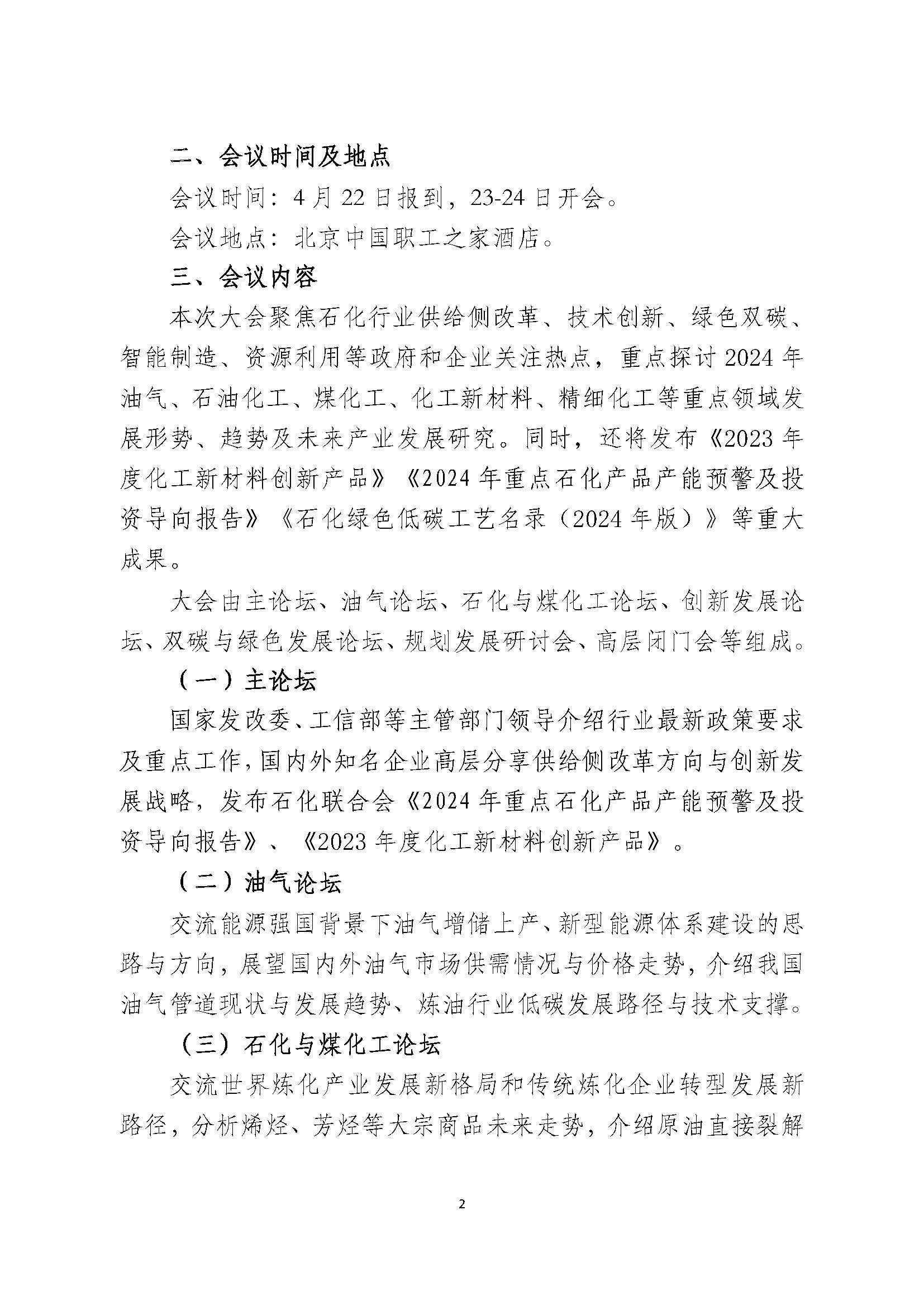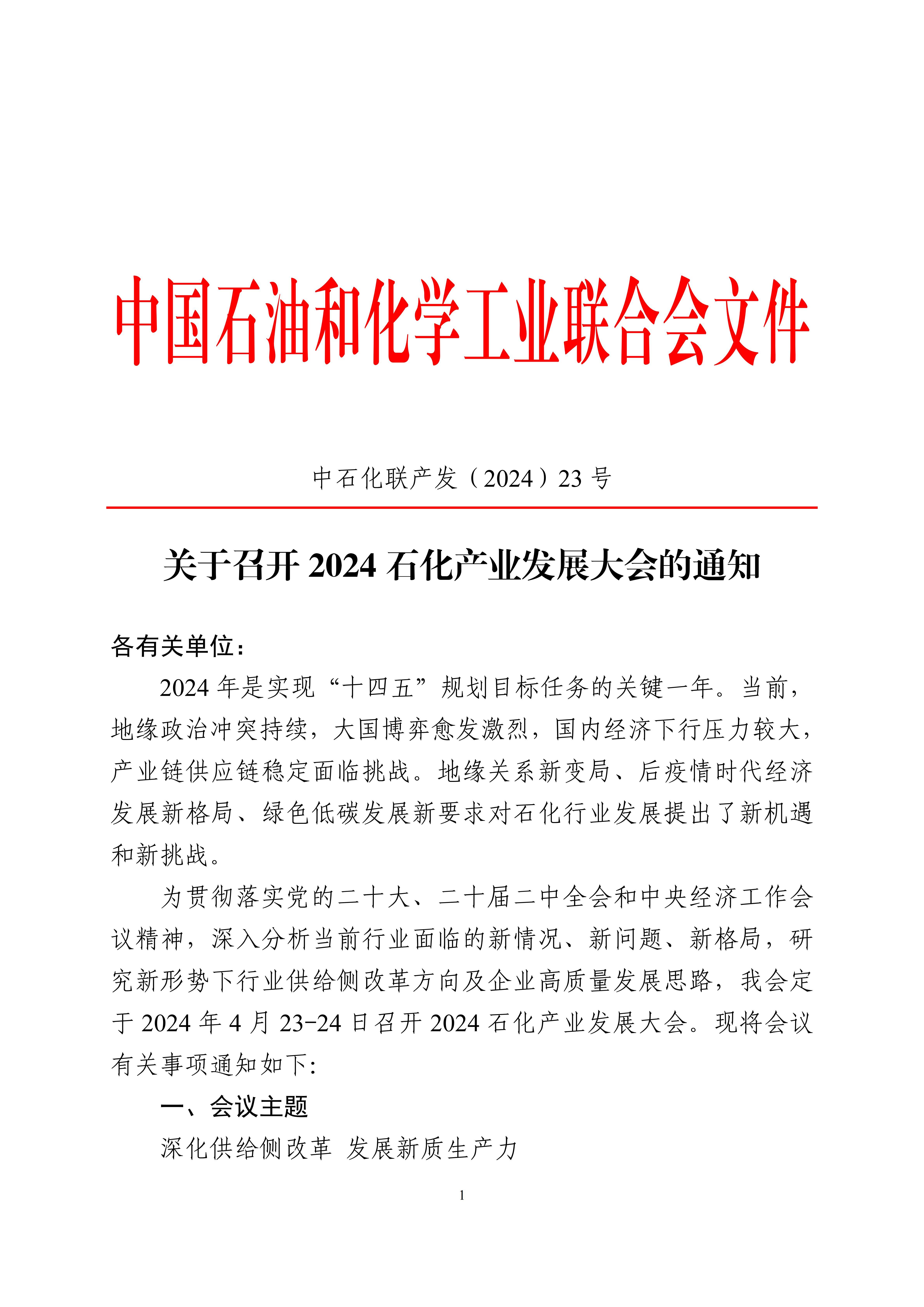 2024年4月23-24日,中國石油和化學工業聯合會將在北京召開《2024石化產業發展大會》,會議安排石油和化學工業規劃院組織“規劃發展研討會專場”,本次研討會主題是:石化化工領域之未來產業研究。