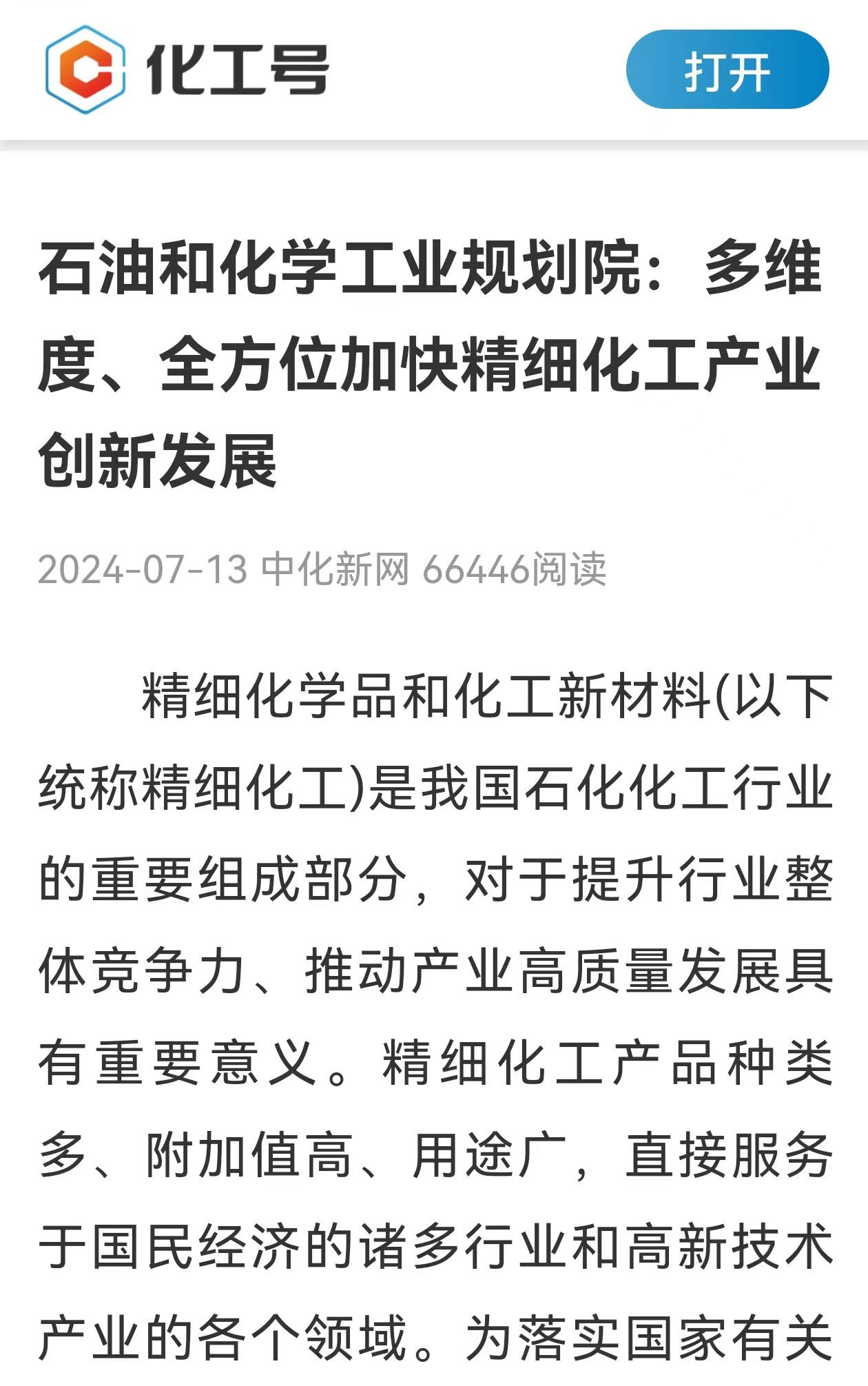 【編者按】7月12日,工業和信息化部等九部門印發《精細化工產業創新發展實施方案》,中央電視臺財經頻道播報了新聞。石油和化學工業規劃院作為全程編制參與單位,第一時間組織編寫了解讀文章。一經在中化新網發表,短短一天多時間,閱讀量就達到6萬多人。