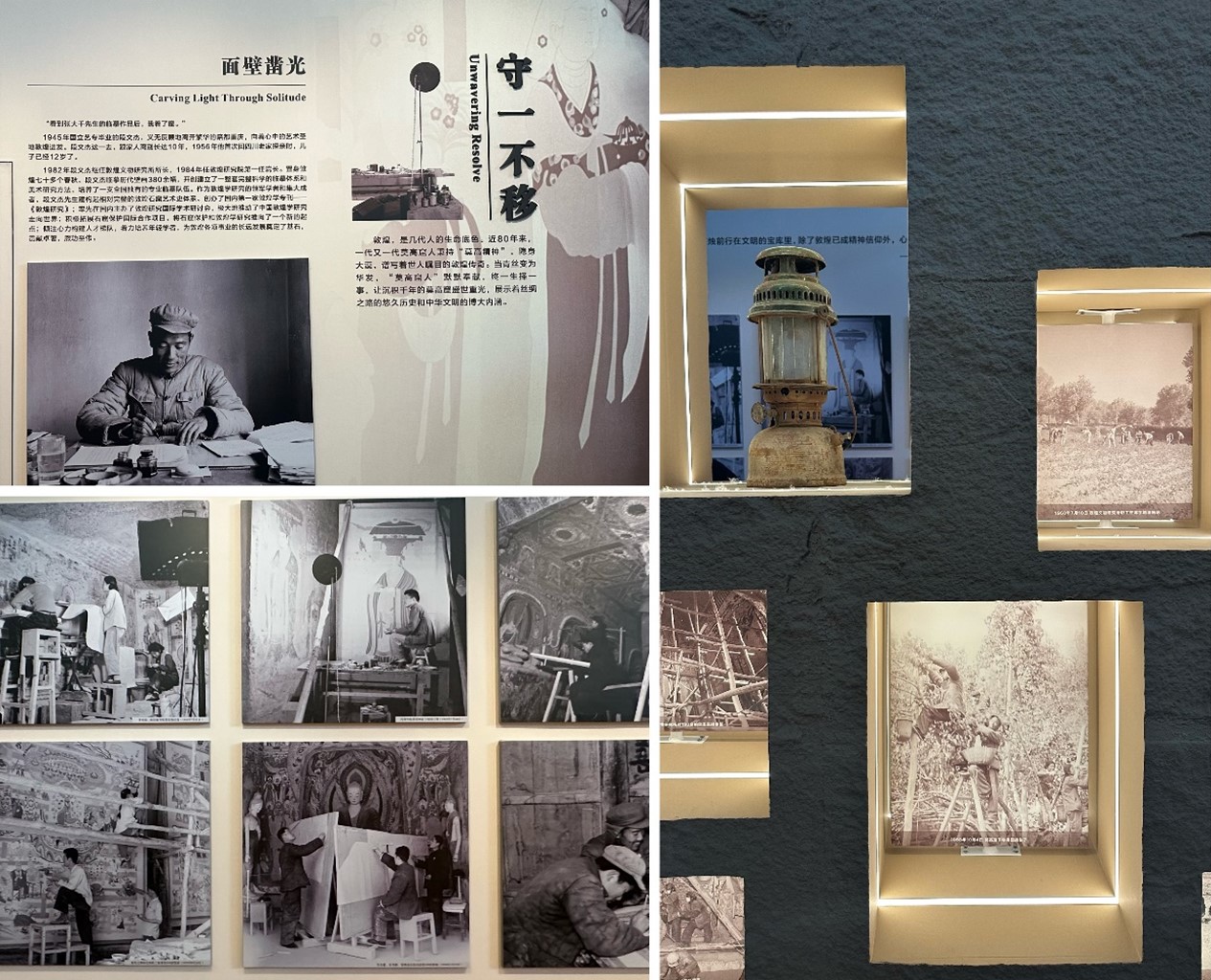 步入展廳,珍貴的歷史文獻(xiàn)、老照片及視頻影像映入眼簾。常書鴻先生在艱苦環(huán)境下使用的簡陋工具,段文杰先生密密麻麻的研究手稿,都訴說著他們?yōu)槎鼗褪聵I(yè)的無私付出。在極端惡劣的自然條件下,他們克服物資匱乏、交通不便等重重困難,以堅定的信念和頑強(qiáng)的毅力,讓莫高窟在新時代煥發(fā)新生機(jī)。這些都詮釋著“堅守大漠、甘于奉獻(xiàn)、勇于擔(dān)當(dāng)、開拓進(jìn)取”的“莫高精神”。
