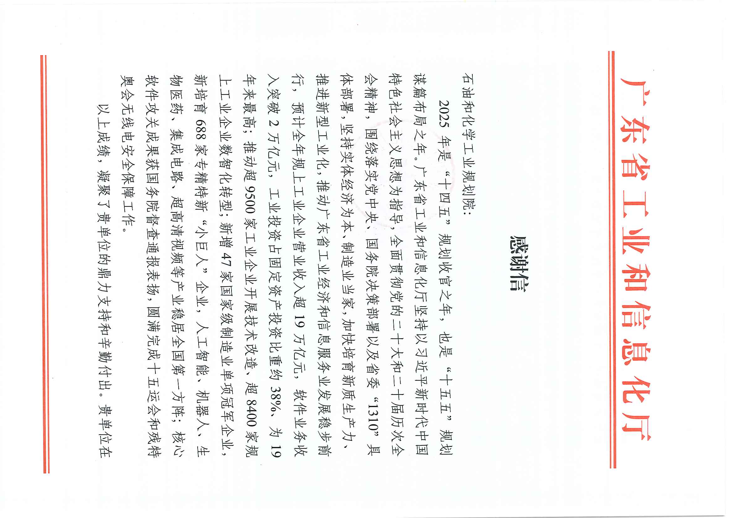 2025年是“十四五”規劃收官之年,也是“十五五”規劃謀篇布局之年。石油和化學工業規劃院積極發揮行業智庫的作用,支撐廣東省工業和信息化廳在綠色石化產業高質量發展、化工新材料產業創新發展、石化化工行業運行分析等方面開展了一系列工作,獲得了廣東省工業和信息化廳的高度認可。