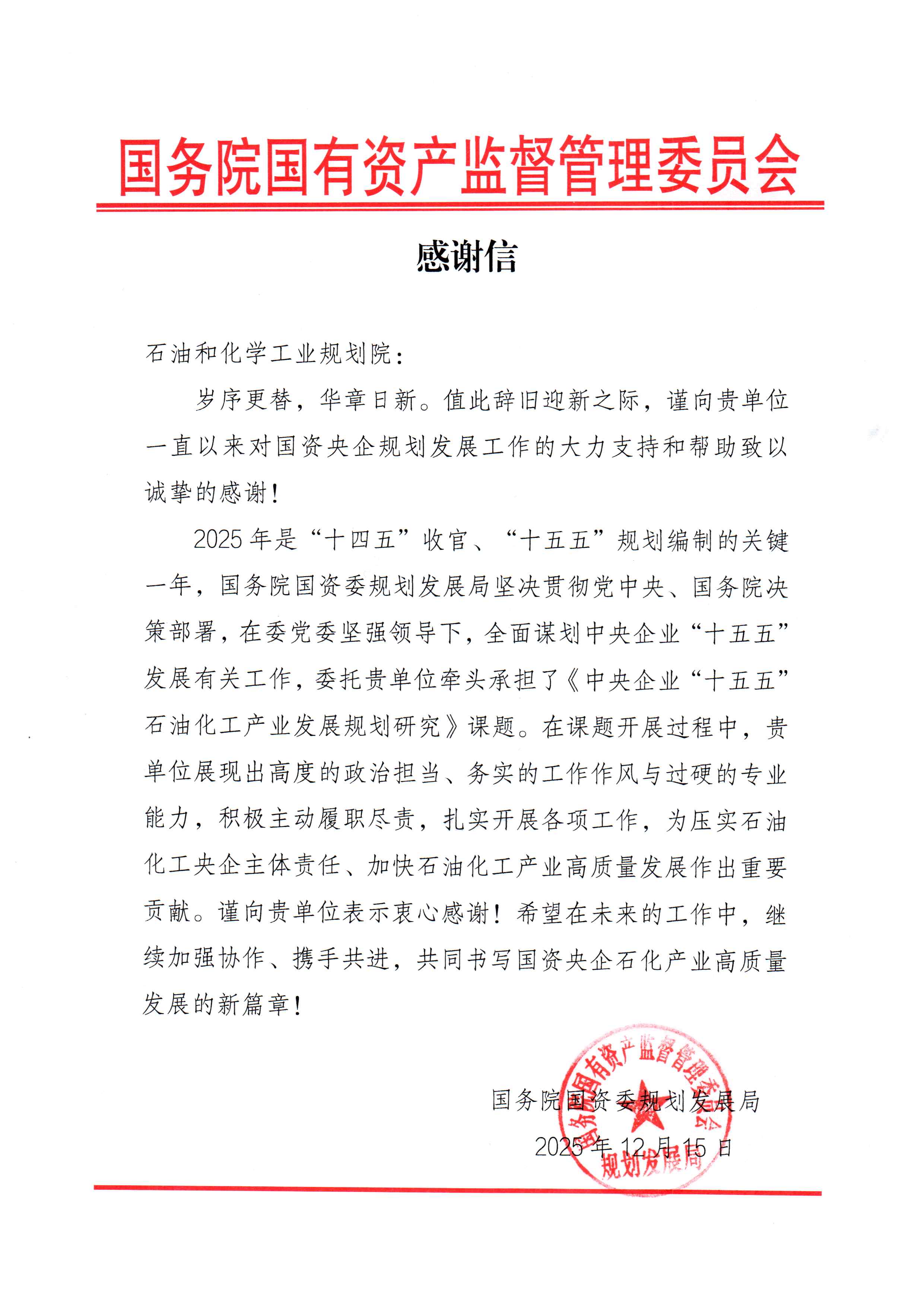 2025年是“十四五”收官、編制“十五五”規(guī)劃的關鍵一年,石油和化學工業(yè)規(guī)劃院積極發(fā)揮國家智庫的作用,支撐國務院國資委規(guī)劃發(fā)展局在中央企業(yè)“十五五”石油化工產業(yè)發(fā)展規(guī)劃研究方面開展了一系列工作,獲得了國務院國資委規(guī)劃發(fā)展局的高度認可。